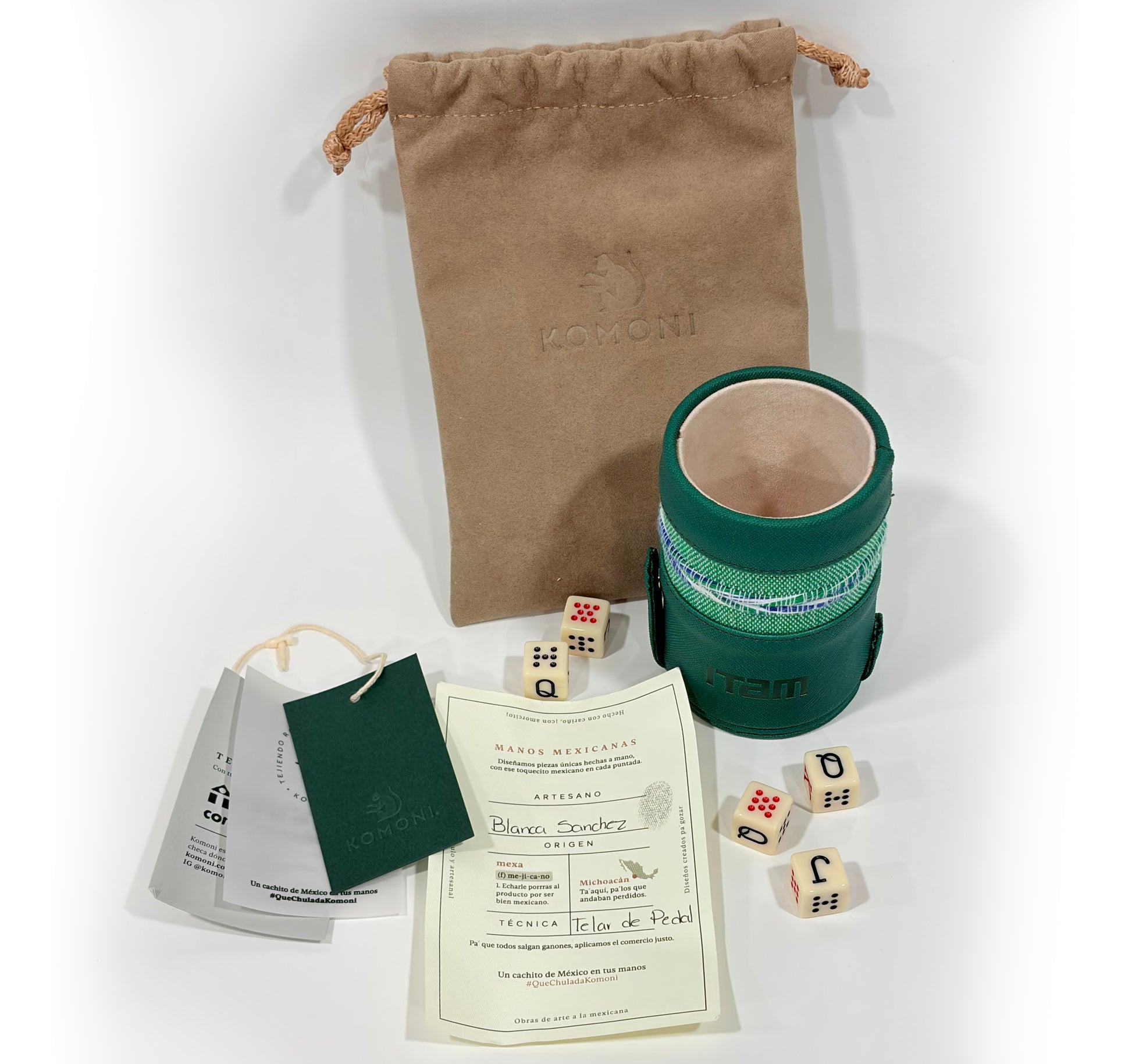 Set de dados komoni con empaque artesanal, listos para ser usados en una partida. Desenvuélvete en la aventura del juego.