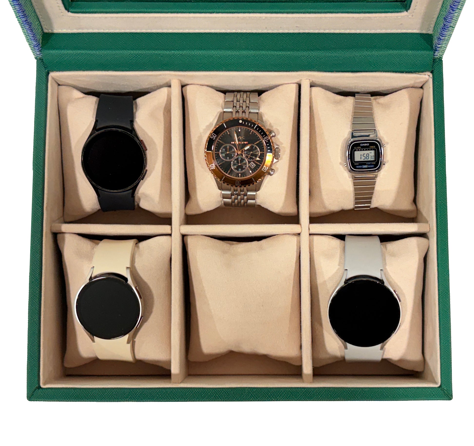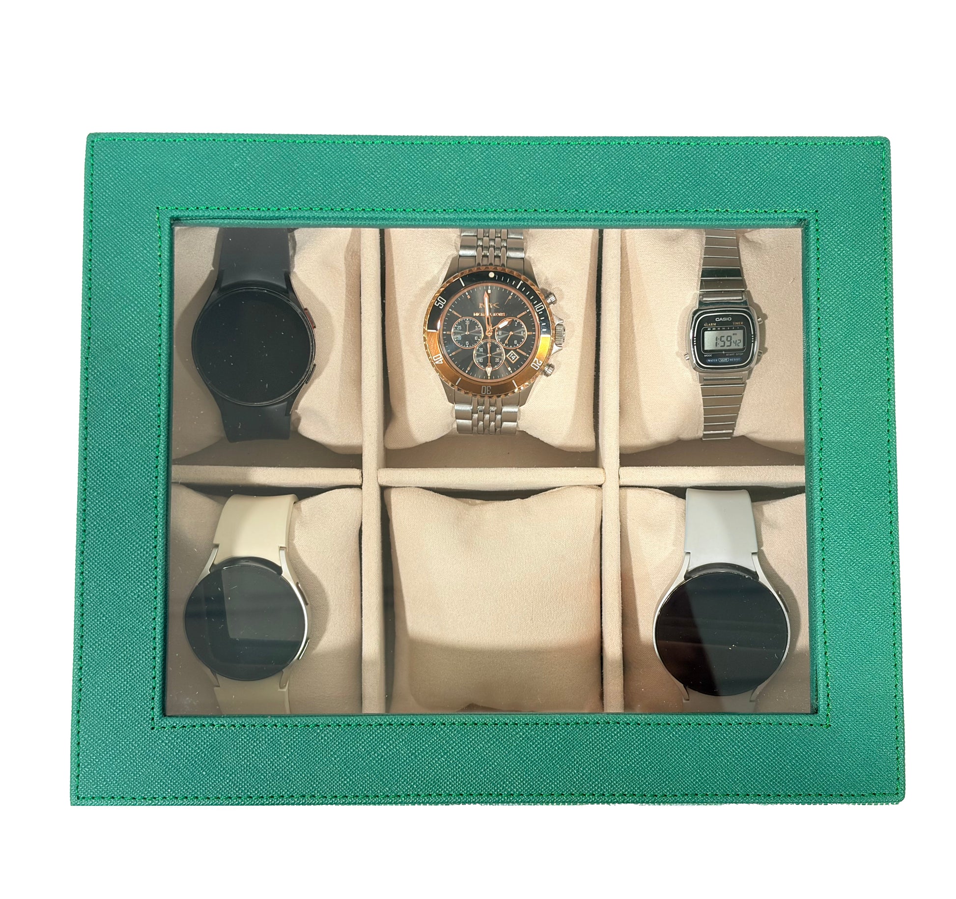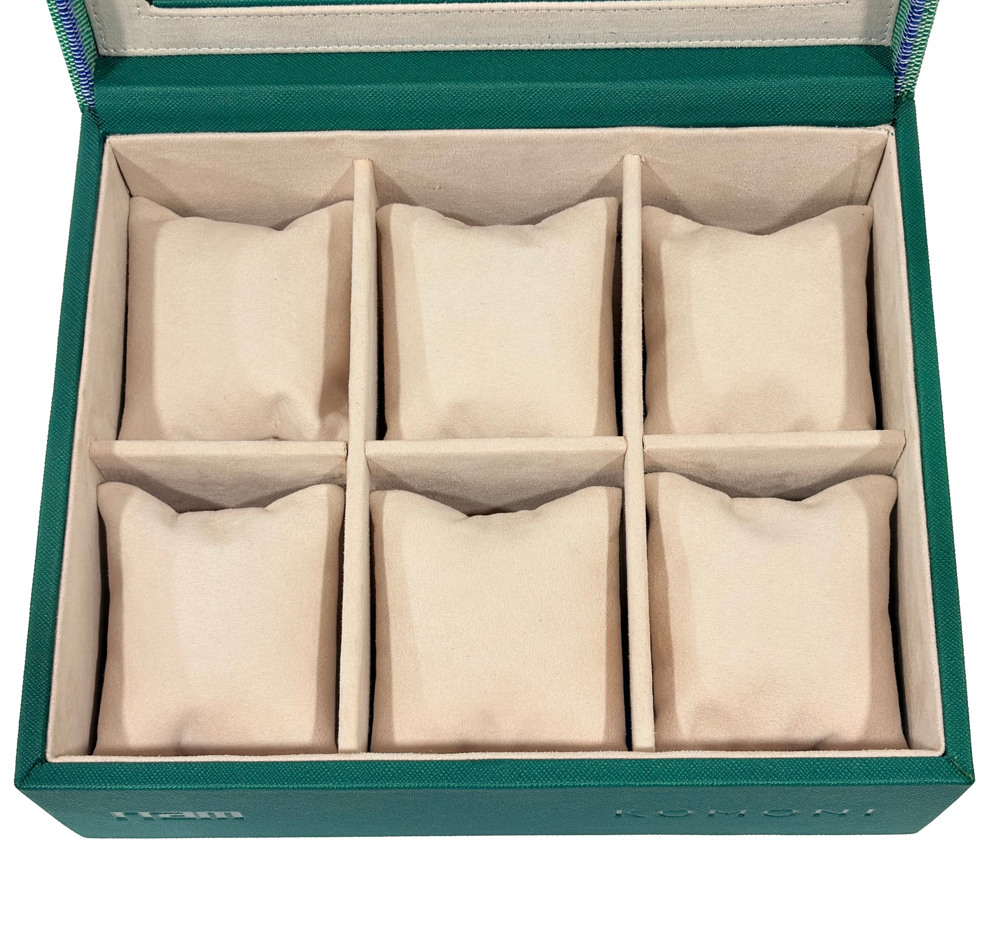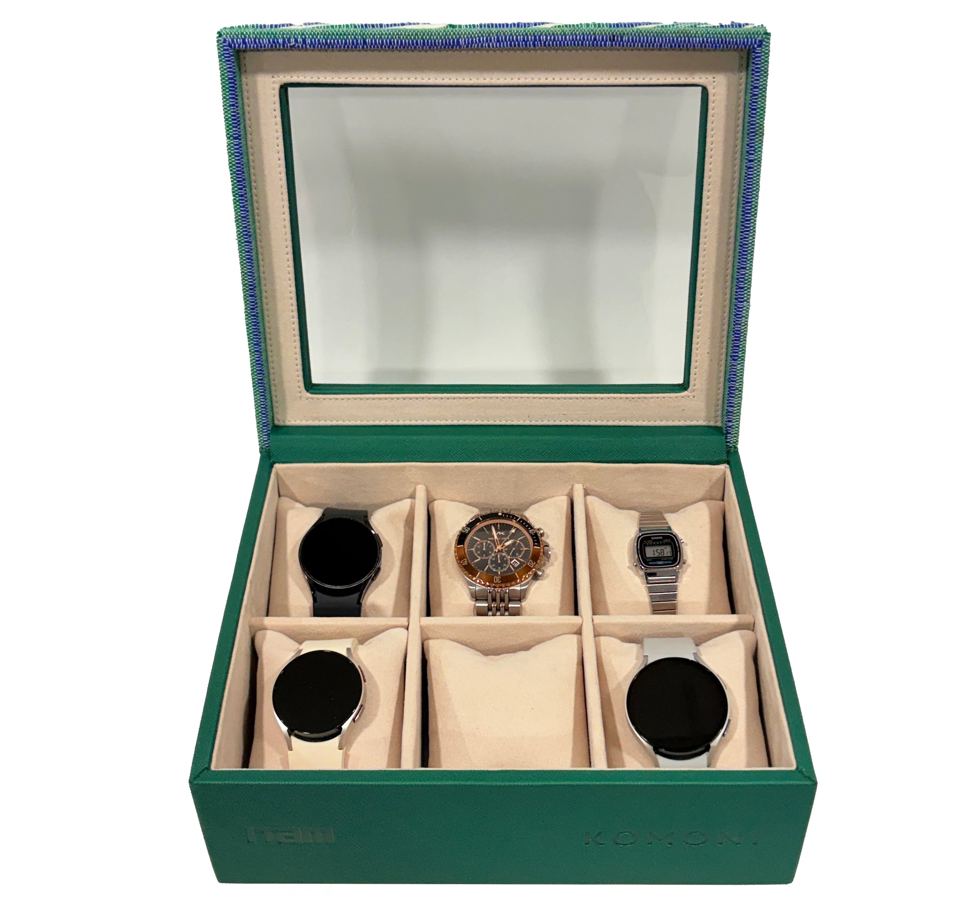 Guarda tus prestigiosos relojes en este relojero komoni. Embellece tu muñeca.